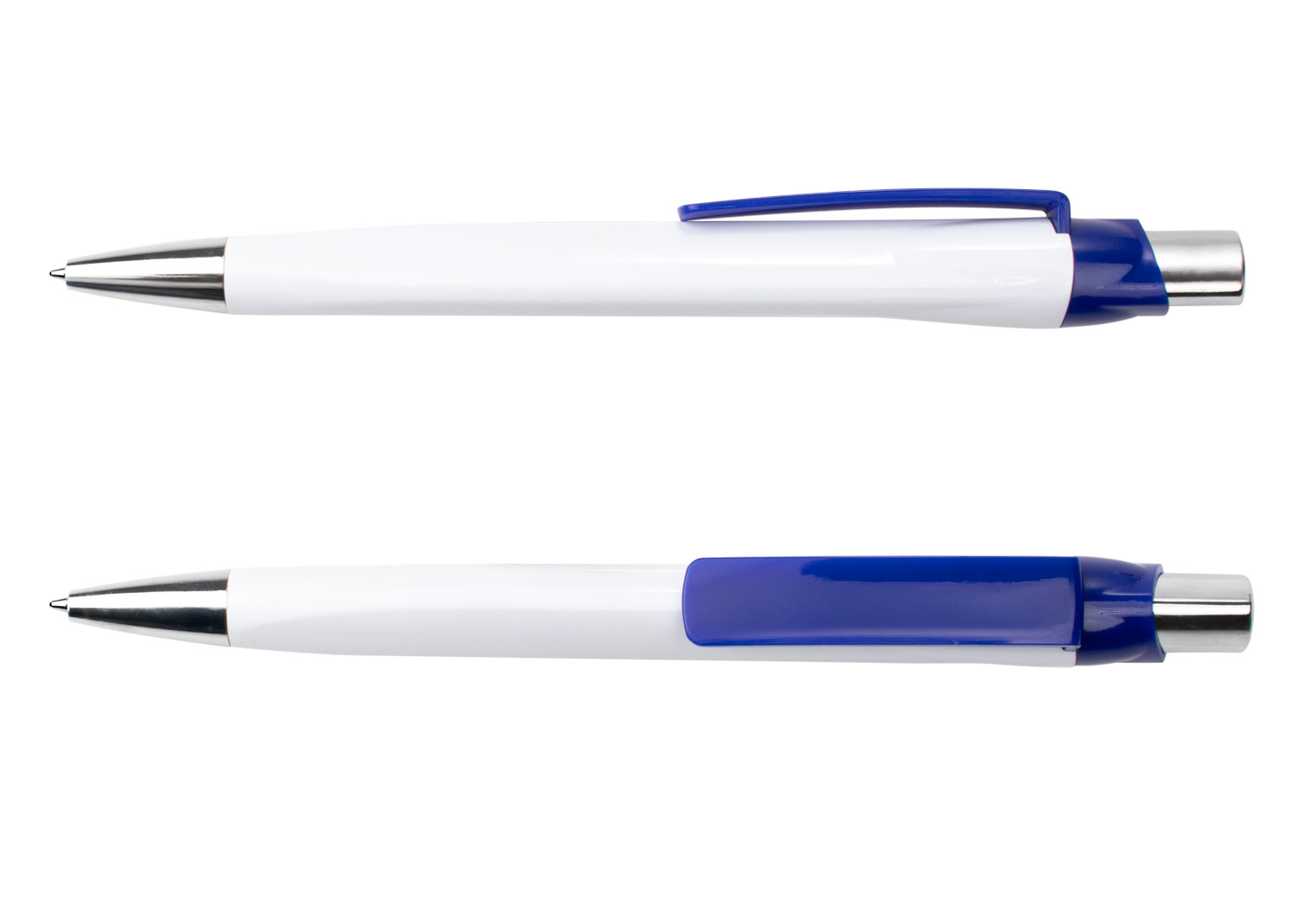 Bolígrafo con barril blanco sólido, clip de color sólido, punta y empujador cromados. Su diseño combina acabados modernos con funcionalidad, ideal para uso diario en entornos laborales o académicos.