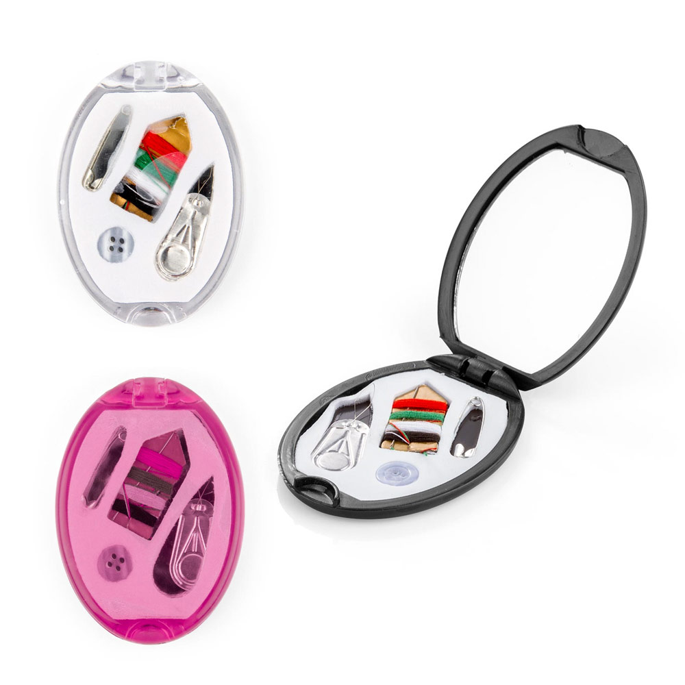 Minicosturero con espejo. Incluye hilos de colores, aguja, gancho nodriza, enhebrador y botón.
