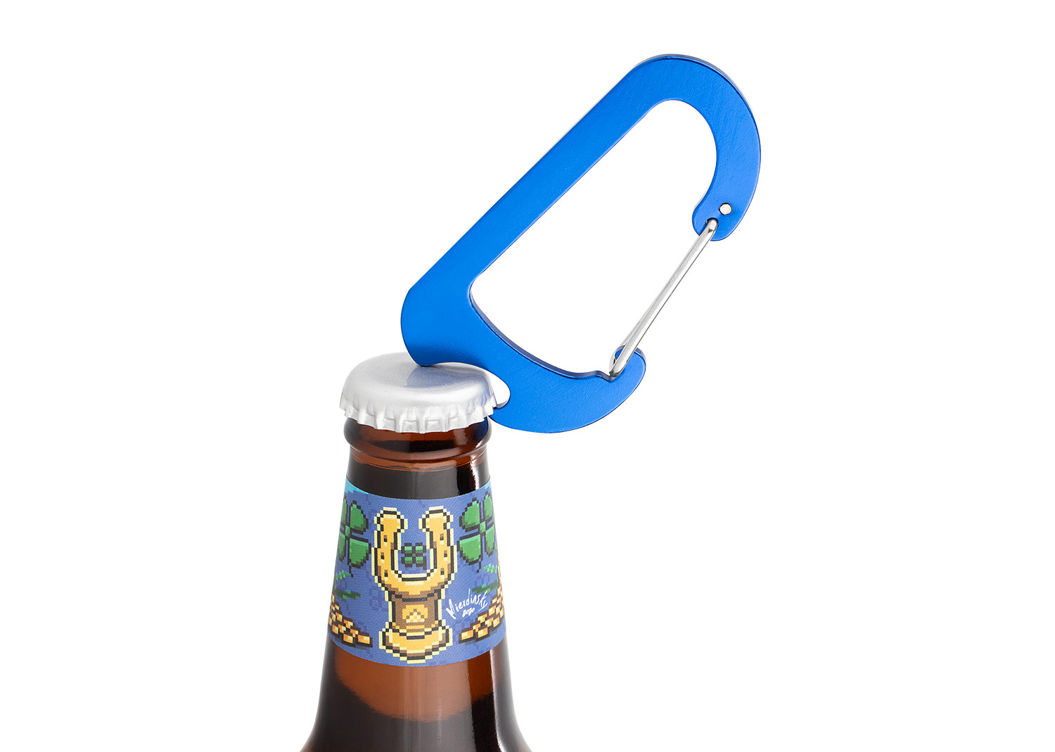 Gancho carabinero metálico multipropósito con abrebotellas integrado. Ligero, resistente y práctico para llevar en morrales, llaveros o actividades al aire libre. Ideal como accesorio funcional para el día a día.