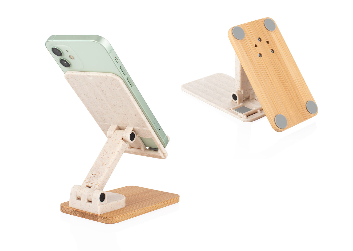 Soporte para teléfono elaborado con materiales ecológicos: base de bambú y estructura de paja de trigo. Ofrece rotación completa de 360° y ajuste de altura para mayor comodidad, además de contar con superficie antideslizante para garantizar estabilidad. Su diseño práctico y sostenible lo convierte en el accesorio ideal para escritorio o mesa.