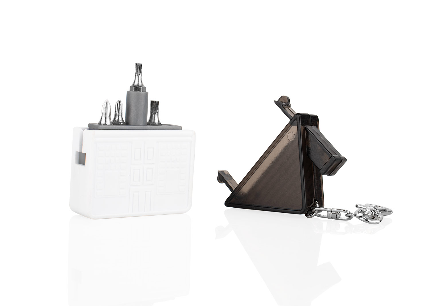 Llavero multifuncional con diseño compacto y práctico. Su sistema de apertura se activa presionando los lados para retirar la tapa, revelando en su interior 4 puntas de destornillador que se adaptan a diferentes necesidades de reparación rápida. Ideal para llevar siempre contigo gracias a su gancho metálico que permite sujetarlo fácilmente a llaves, bolsos o mochilas. Una herramienta útil y portátil que combina funcionalidad y diseño.