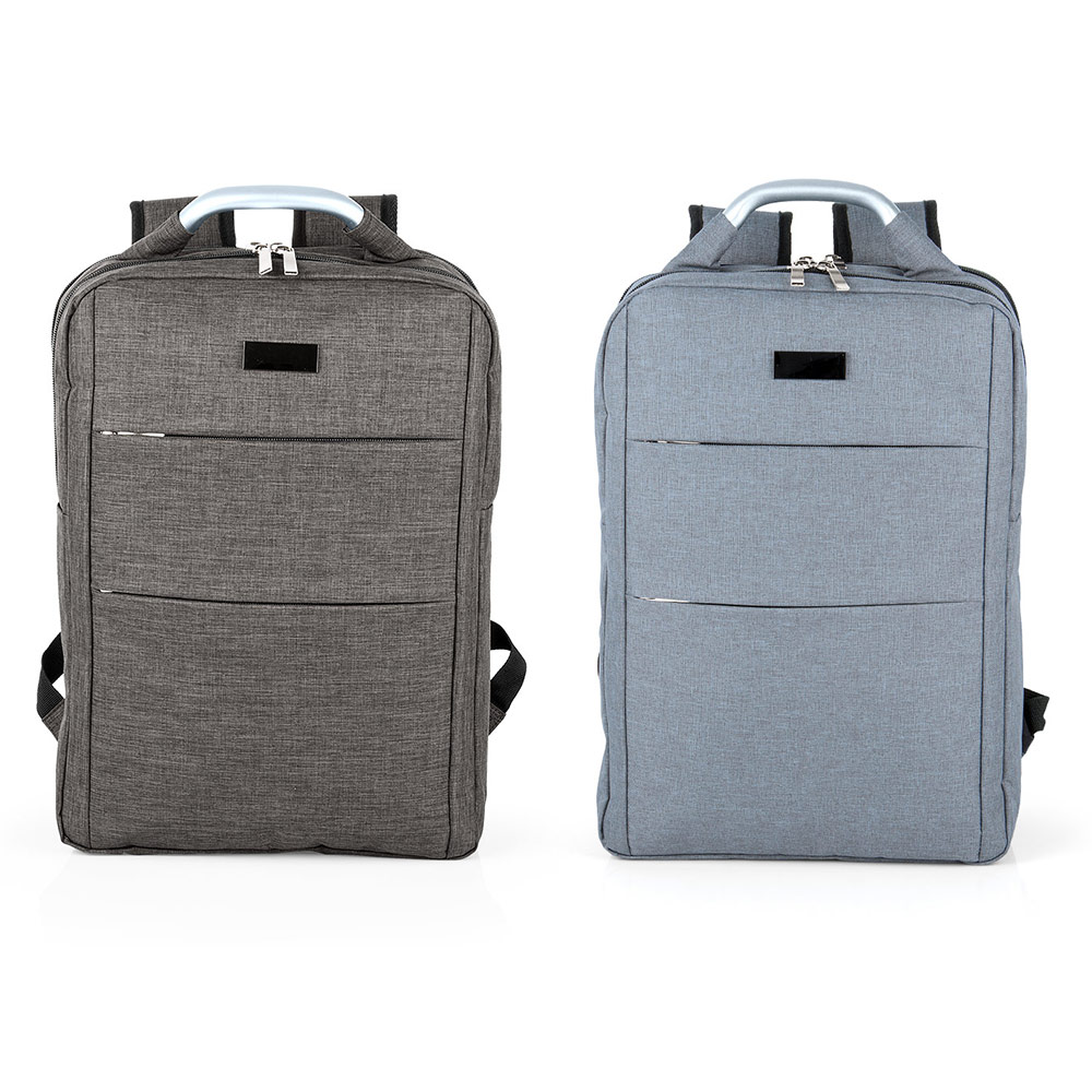 Morral con agarradera en Aluminio y cargaderas ajustables, un compartimento con velcro para portátil de hasta de 14” y el otro con bolsillo interior para bolígrafo y libreta. Doble Bolsillo frontal con cierre de cremallera. Incluye placa metálica para marcar láser. Volumen aproximado: 14 litros.