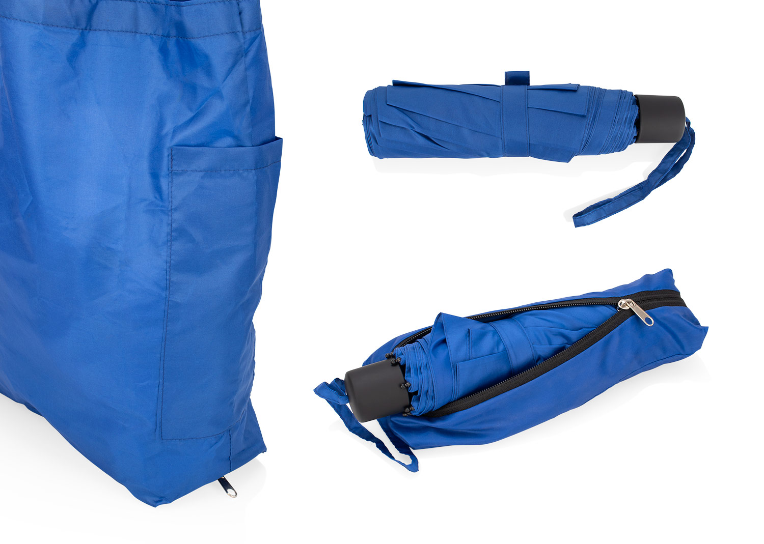 Paraguas plegable de 21 pulgadas con 8 cascos en 3 secciones, apertura y cierre manual completo. Su estructura combina marco chapado negro con 2 secciones de fibra de vidrio, ofreciendo resistencia y flexibilidad. Con tela pongee 190T, cada unidad incluye una bolsa de compras (29,8 X 35 X 11) del mismo material, también a prueba de viento, diseñada para llevar el paraguas junto al bolsillo. El mango es de plástico PP con acabado de goma, cómodo y en colores coordinados.