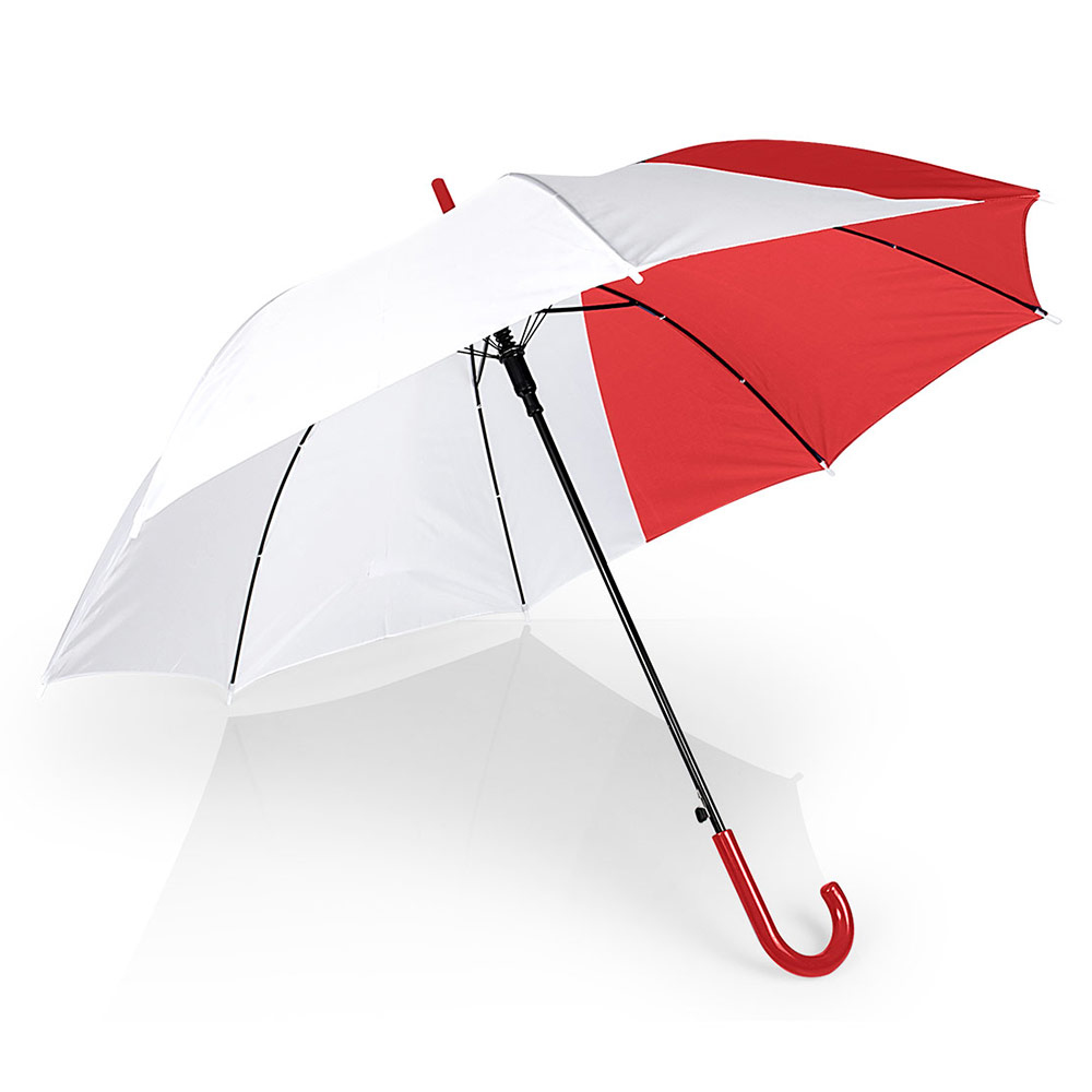 Paraguas de 23” sistema de apertura automática y cierre manual, 8 cascos, eje y varillas metálicas con recubrimiento negro, 190t tela pongee. Mango curvo plástico en PP curvo a juego con el color de la tela. (Paraguas/Sombrilla)