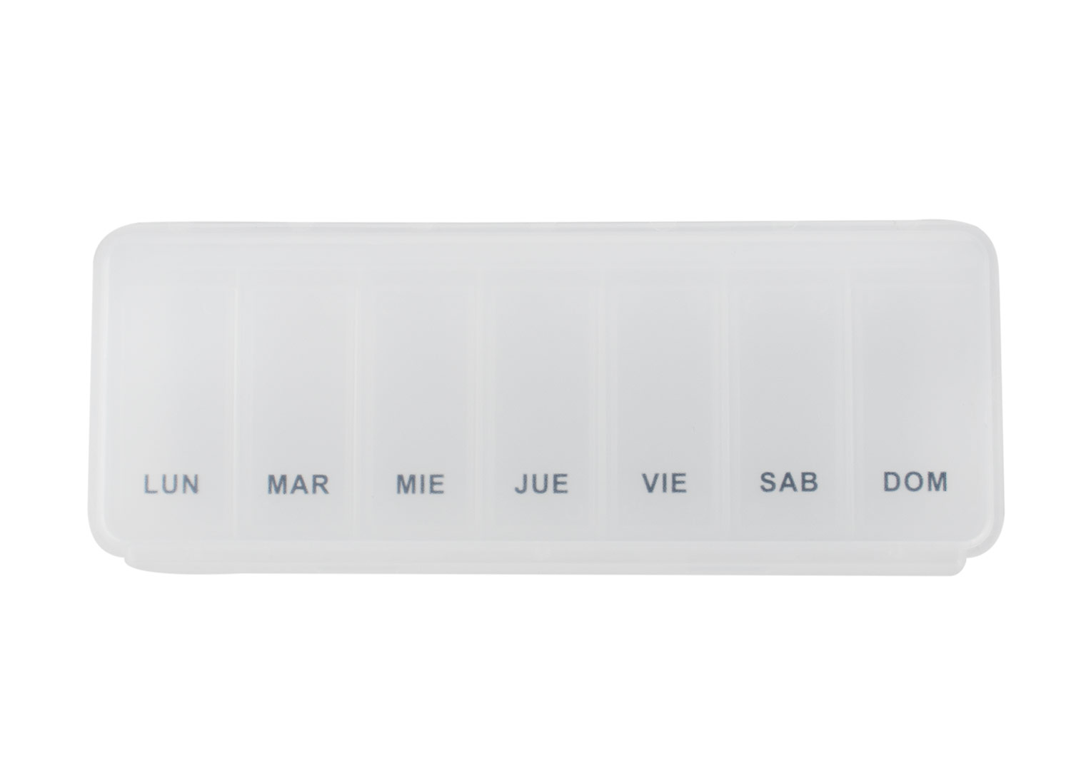 Organizador práctico para medicamentos, diseñado con 7 compartimentos individuales (6,3 X 2,1) para cada día de la semana. Fabricado en plástico transparente con tapa abatible, permite visualizar fácilmente el contenido y mantener el control diario de la dosis. Ideal para uso personal en casa o durante viajes.