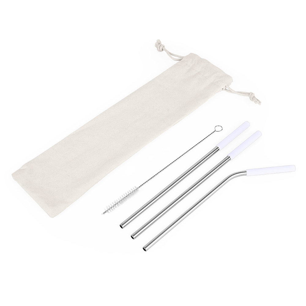 Set de pitillos ecológicos x 3 und (uno de ellos es curvo), con boquilla en silicona, cepillo para limpiarlos y estuche textil con cordón. Producto de uso personal. No se aceptan devoluciones.
