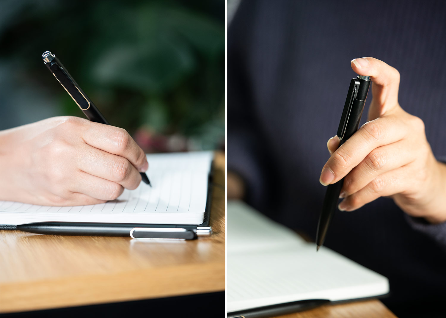 Bolígrafo retráctil de aluminio reciclado, más un lápiz externo de aluminio reciclado empaquetados en caja de cartón negra que se desliza para abrir. (Bolígrafo/Esfero)